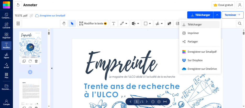 Une fois que vous avez terminé de modifier votre PDF, cliquez sur « Exporter ». Smallpdf vous propose plusieurs options pour sauvegarder votre fichier modifié :