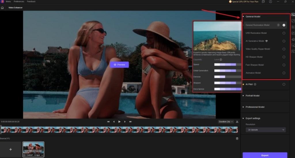 Tout d’abord, j’ai testé le modèle Général, le plus polyvalent des trois. Il fait merveille pour améliorer, restaurer, suréchantillonner et optimiser la plupart des vidéos. Qu’il s’agisse d’un vieil extrait copié depuis un CD ou d’une vidéo basse résolution issue d’applications de réseaux sociaux.
